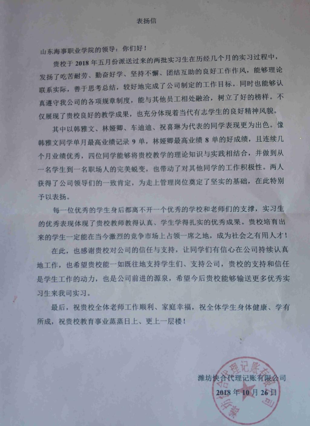 为了帮助员工合理地规划老员工活,进行正确的职业定位,必赢76net于2018年10月31日下午1点30分在图书馆报告厅举行了“会计专业职业规划”报告会,出席此次会议的有:必赢76net经理助理门瑞峰、必赢76net经理助理季丹丹、会计教研室主任王静、潍坊快合财税公司副总经理王丽女士、主管会计徐佳女士、会计总监姚峰先生。会议由团总支书记苑振冬主持,会计教研室和辅导员老师也参加了会议。在会议之前快合财税公司王丽女士向学院赠送了锦旗并送来感谢信。