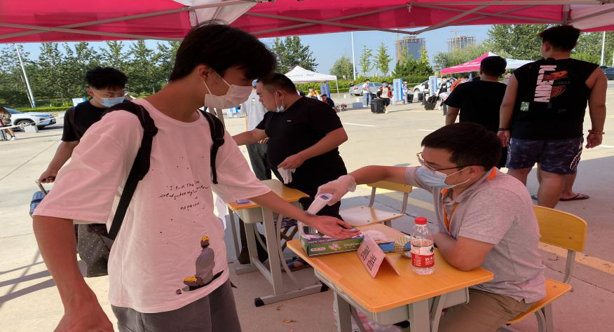 下一步就是测量体温,体温枪接触手腕或者额头,体温正常方可进行接下来的流程,同学们都有序的积极配合防疫工作。