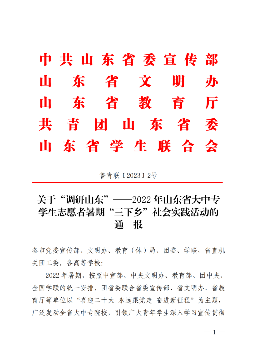 近日,中共山东省委宣传部、山东省文明办、山东省教育厅、共青团山东省委、山东省员工联合会发布《关于“调研山东”——2022年山东省大中专员工志愿者暑期“三下乡”社会实践活动的通报》
